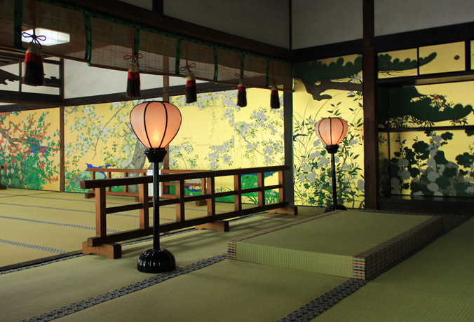 書院内の長谷川等伯襖絵のレプリカが煌びやかです。