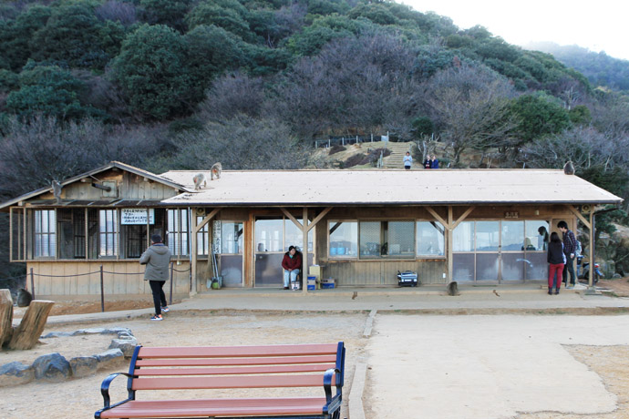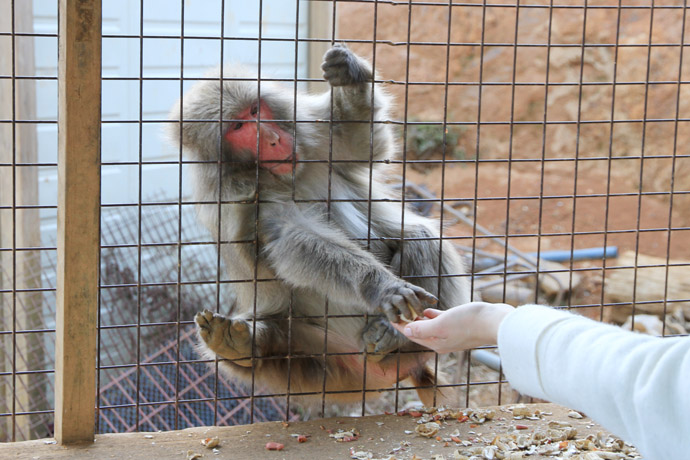 時間になるとスタッフが広場で一斉に餌をまくそうです。下は展望台にある休憩所 その一角(左)でお猿に餌をやることができます。