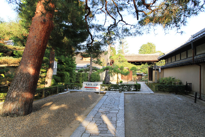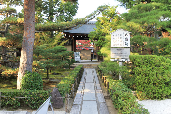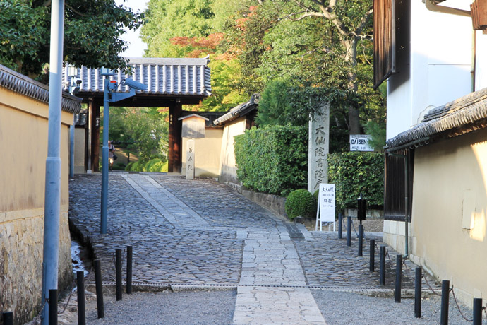大徳寺の塔頭のうちで、通年公開している「大仙院」も内部が撮影禁止です。宗務本所の横の道をさらに北に行くと、大仙院の石標と看板が見えてきます。