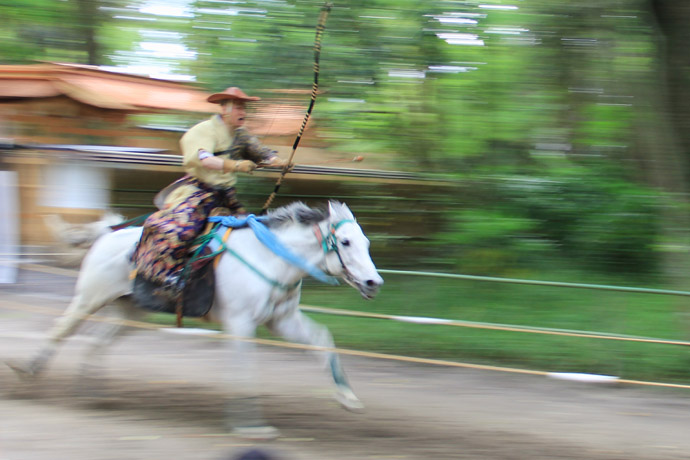 馬が早く走る方が上下動が無くて的を狙いやすいそうです。一方で、矢を射るタイミングが難しく、矢を取り出して構える時間が少なくなります。実際に、矢を射る前に的を通り過ぎてしまう場合もありました。