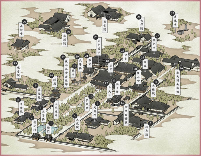 門院は深く仏教に帰依、夢窓疎石国師によって禅学を修し、延元元年(1336)天皇が薨去されると落飾、尼となりました。暦応2年(1339)伏見離宮の傍らに国師を開山に迎えて一寺を建立、その法号をもって大光明寺と称し天皇の菩提を弔いました。