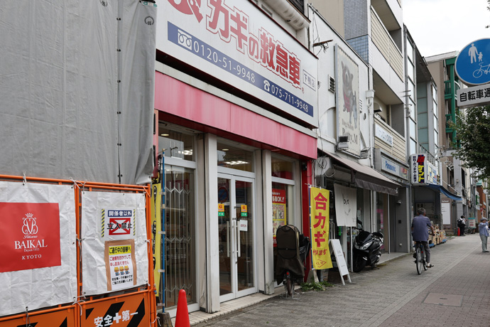 北大路下鴨本通の交差点に来ました。南西角の「京都ケーキ・洋菓子のバイカル 下鴨本店」は現在建て替え中で、9月30日に完成予定。西北に1ブロックのところに仮店舗があります。