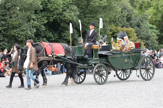 1.名誉奉行 市会正副議長、府知事、市長、 時代祭協賛会会長、京都商工会議所会頭らが馬車で行進します。(他の神社と異なり神幸列の御旅所はなく、京都御所は途中に滞在する場所で還幸列はありません。)