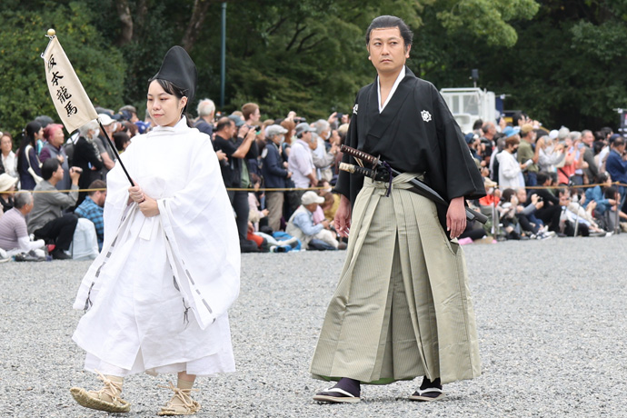 「幕末志士列」 明治維新で活躍した人物がそれぞれの装束で登場します。最初は長州藩士の桂小五郎(後の木戸孝允)、次は西郷隆盛、坂本龍馬の仲介で薩長同盟を結び、江戸城の無血開城も果たした薩摩藩士です。