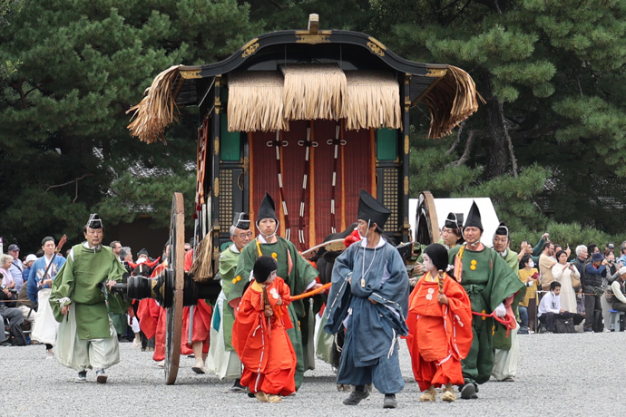当時の最高級の牛車「檳榔毛唐庇車(びんろうげからびさしくるま)」に秀吉が乗っている設定です。「檳榔」は「蒲葵(びろう)」というヤシ科の植物の葉、「唐庇」は「唐破風」のことです。当時の豊臣家の勢いと財力がうかがえます。