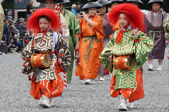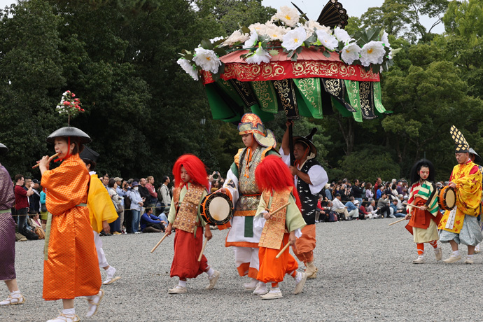 「室町洛中風俗列」室町時代後半に経済力を蓄積した京の町衆によって盛んに催された風流踊りを再現。風流傘を中心に、囃子方、踊り手で構成されます。先頭の赤熊は鞨鼓童(かっこうちわらべ)、久しぶりにカワイイ姿を見ました。
