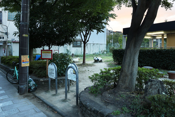 江戸時代にはこの辺りで出雲阿国の歌舞伎が行われ、数々の芝居小屋が建ち並びました。出演する役者や観客のための宿が増え、宮川町のもとになったといわれています。(交差点の南西角は「団栗橋公園」、可愛いパンダの遊具が見えます。)