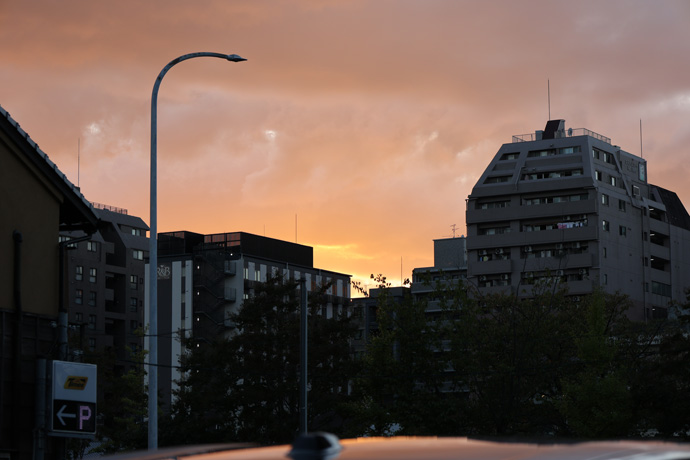 宮川町は江戸時代末期から、二条新地、北野、七条新地の「出稼」という名目で遊女商売が公認され、遊郭は昭和33年(1958)まで存続しました。最盛期には貸座敷数359軒、娼妓数314人だったといわれます。(建物の間から夕焼)