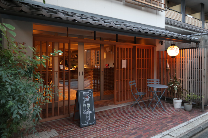 「SIGHTS KYOTO -サイツキョウト-」 1階はカフェで、アルコール類、オーナーのおススメやオリジナルのグッズもあります。2階は靴を脱いで上がるワーキングスペースになっています。吹き抜けの中庭には滝があるそうです。