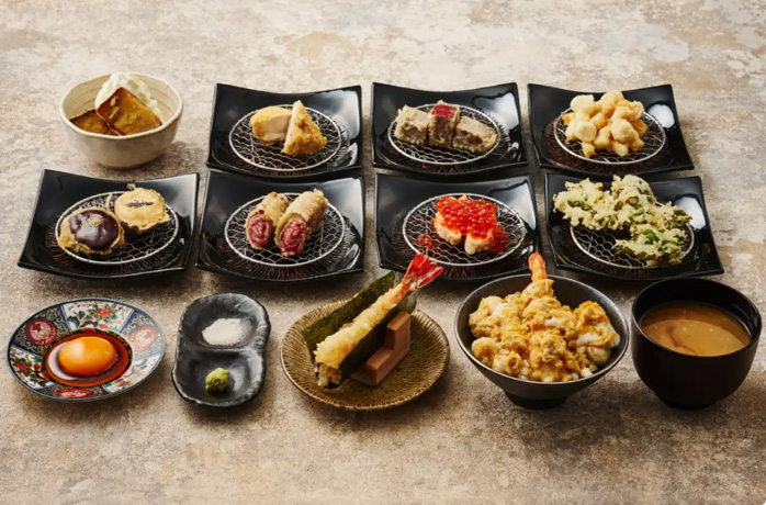 下はおまかせスペシャルコースで、海鮮かき揚げ、中トロ天キャビアのせ、とり天、本マグロ天ロールいくらのせ、なす天 田楽、季節の野菜天、和牛 赤身、和牛 すき焼き、海老天とじ丼いくらのせ、奇跡のさつまいも天~バニラアイスを添えて~。
