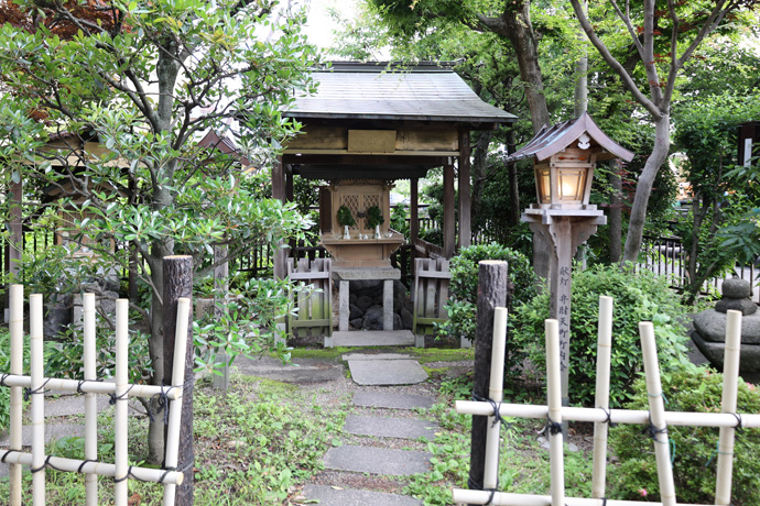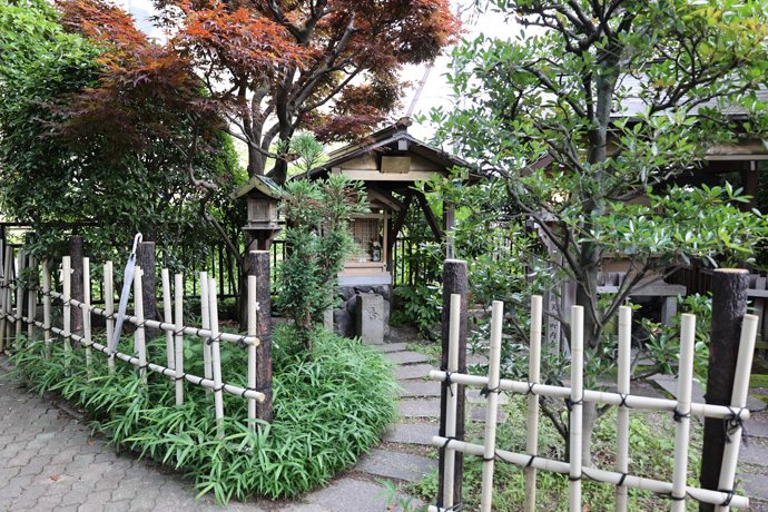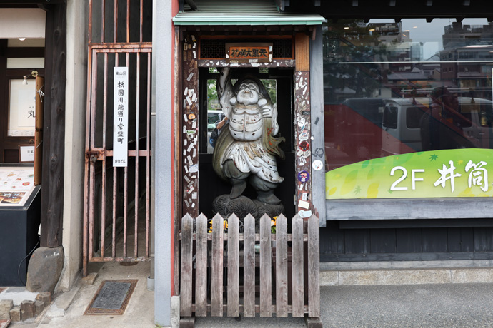 「花咲大黒天」 大きな袋を肩に、右手に小槌、米俵に乗って、ふくよかな大黒さんで、祠の回りには千社札が一面に貼られています。千社札は芸姑舞妓さんや祇園のお店のものが多く、芸事や商売繁盛の祈願をすれば花を咲かせてくれるといわれています。