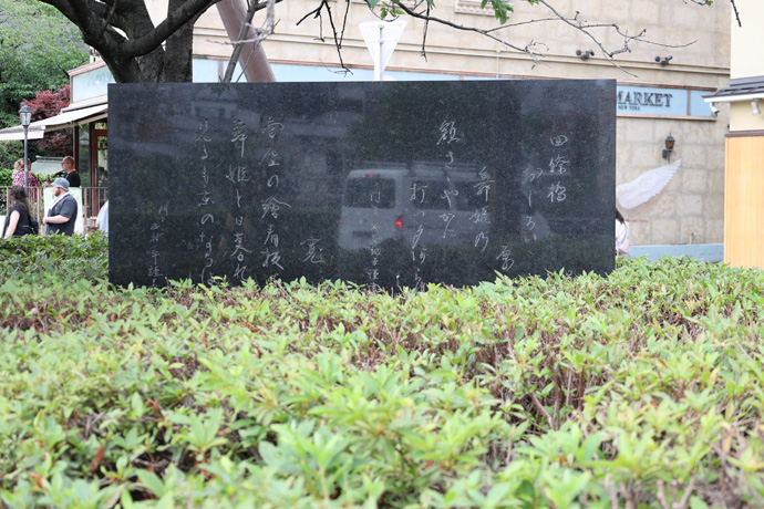 「与謝野夫妻の歌碑」、右は与謝野晶子「四條橋おしろい厚き舞姫の額(ぬか)さゝやかに打つ夕あられ」、左は与謝野寛「南座の繪看板をは舞姫と日暮れて見るも京のならはし」。