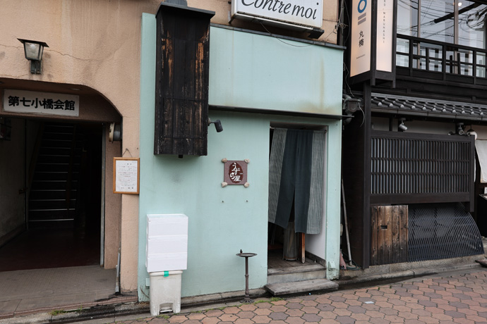 「うずら屋」 こだわりの地鶏と京野菜の炭火料理のお店です。目の前で調理される炭焼き料理は素材の旨味を閉じ込め、炭の香りを纏い絶品だそうです。2階はバーの「CONTREMOI(コントロモア)」、建物は「第七小橋会館」です。