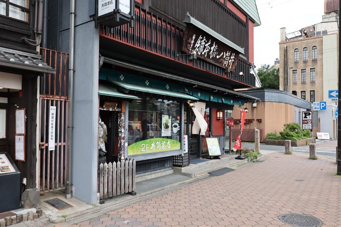 「井筒ビル」 1階は井筒八ッ橋本舗・祇園本店で各種お土産品があり、2階の井筒茶店では珍しい歌舞伎銘菓「夕霧」やパフェなどの甘味がいただけます。