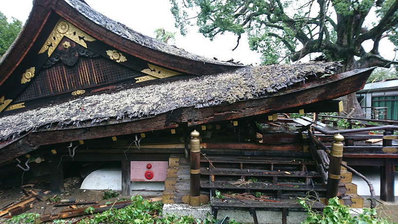 本殿の檜皮屋根の損傷、数十本の桜の倒木などの甚大な被害を受けました。拝殿はそれまで大きな損壊はありませんでしたが、この台風により六本の柱が折れ、倒壊してしまいました。下は平野神社のHPからの転載です。