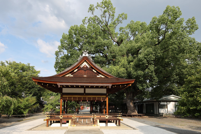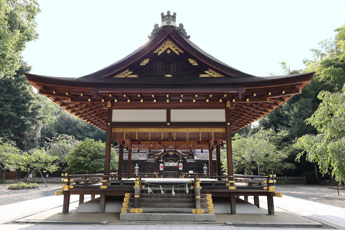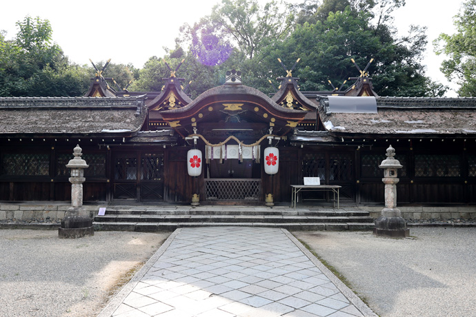 現在の社殿は江戸時代初めの寛永年間(1624-44)の造営で、平野造とよばれる本殿は重要文化財です。(手前は本殿拝所で、本殿は奥にあります。)