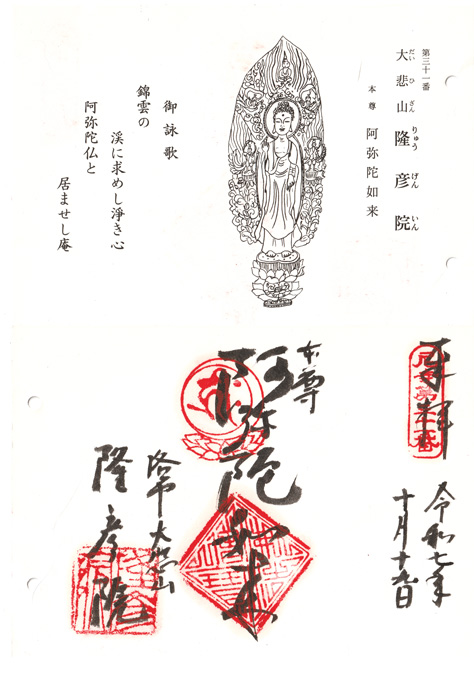 御朱印は見開きになっていて、一枚には本尊の姿と御詠歌「錦雲の 渓(たに)に求めし浄き心 阿弥陀仏と 居ませし庵」がありました。