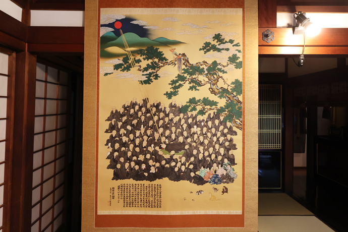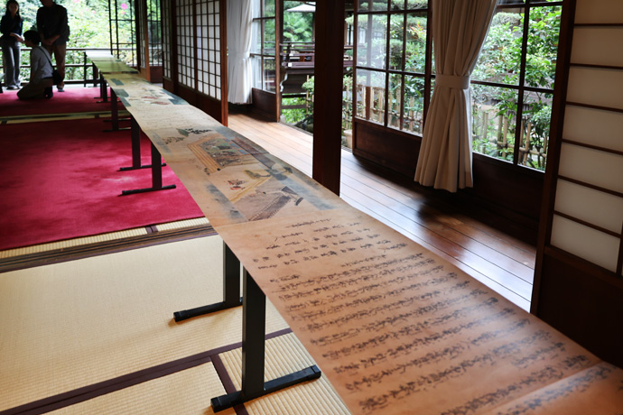 本堂には様々な寺宝が展示されていて、下は「法然上人絵伝 弘願本」(重文)、法然上人の伝記を絵巻であらわしたものです。知恩院にある絵伝は国宝になっています。法然上人は長承2年(1133)美作国(岡山県)の地方武士の家に生まれました。