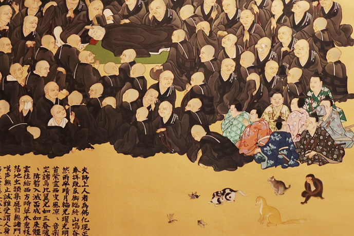 画面の右下には在家の人々や動物、昆虫が描かれています。平成に書かれたもので、猫もいてちょっと嬉しくなりました。