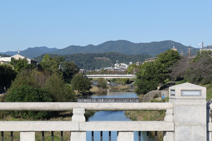 出町橋の上から賀茂川の上流方向。向うに葵橋が見えます。河合橋、加茂大橋、出町橋、葵橋を総称して出町四橋というそうです。その向うは北山で若狭まで続いています。