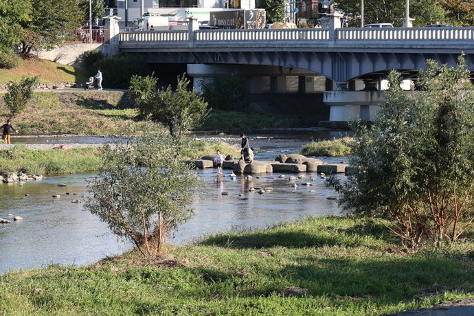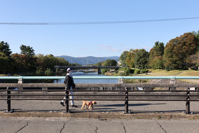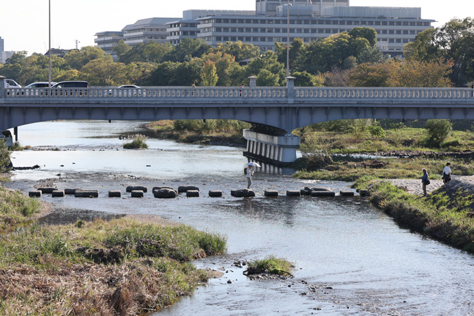 こちらは南の方で、加茂(賀茂)大橋の手前に飛び石が見えます。当初は川底を安定するための帯工の附属物でしたが、いつしか名物になりました。平日の昼間だったので観光客はほとんど見かけませんでした。