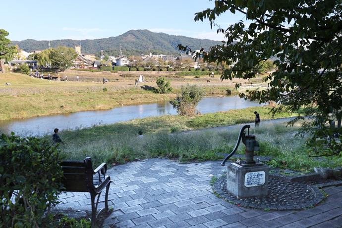 タネゲンさんの前から、手前に手押しポンプがあります。鴨川の西には地下水脈があって、出町のお豆腐屋さん、梨木神社、下御霊神社などはこの水脈の水をくみ上げています。