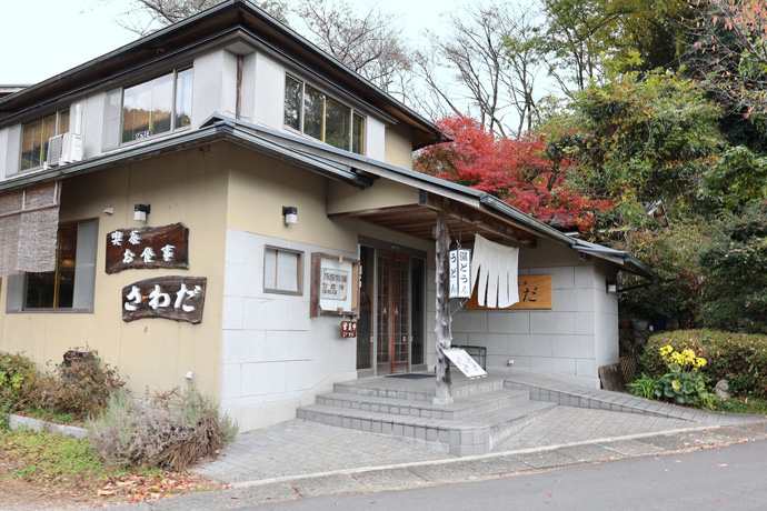 バス通りを渡ったところにある「さわだ」 湯豆腐やうどんを始めとしたお食事のメニューが各種あり、2階は喫茶と民芸品の販売をしています。参道を少し上ったところからでもお店の2階に入れます。