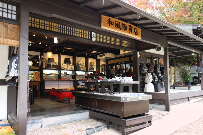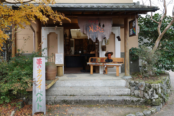 手前は「山路」 風呂敷、ガーゼハンカチ、手拭い、古布、バッグや巾着袋など、京都や大原の雰囲気のあるオリジナル商品を製作販売しています。向う隣には「てすき和紙」の看板がありますが同じお店かも知れません。