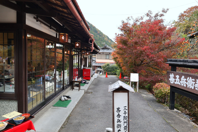 「甚五兵衛茶屋」 蕎麦などの麺類や親子丼などのお食事処です。右から流れてきた呂川がここで北に向きを変えて律川と合流します。参道はここから本格的な坂道になります。