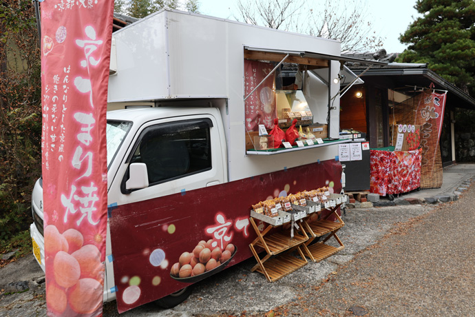 「京手毬焼本舗」 京手毬焼は京都特産の白味噌を生地に練りこみ焼き上げた、一口かすてらです。関西の百貨店やスーパーなどの催事にも出店しています。向うのお店が2003年に創業した本店で、キッチンカーが止まっていました。