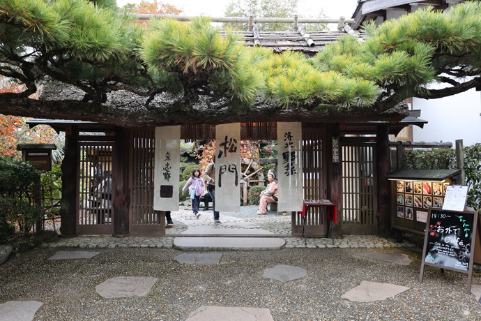 「志野 松門(しょうもん)」 地元の京野菜をつかった料理がいただける古民家レストランで、松の木で覆われた門が店名になっています。人気なのであらかじめ予約をした方がよいお店です。