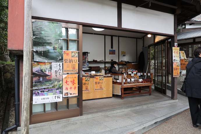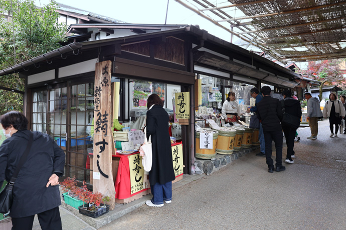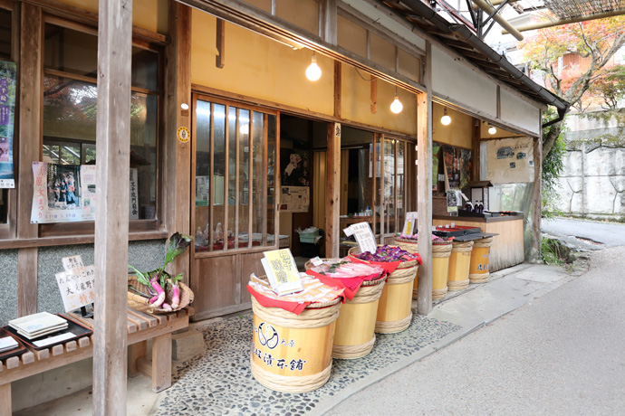 「辻しば漬け本舗 三千院前店」 1970年に創業、しば漬、すぐき、千枚漬、四季折々の京都の御漬物、ちりめん山椒や佃煮を製造販売しています。本店は途中のバス停・野村別れの前にあり、このお店が開店しているのを久しぶりにみました。