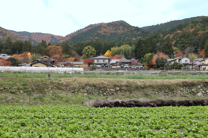 畦道を少し行ったところから、南の斜面にある旧街道(三千院の車参道)が見えます。正面は駐車場、右は念佛寺です。