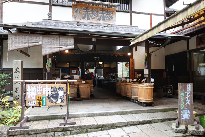 見晴らし台から下りたところが「志ば久本店」。しば漬けの老舗で、紫蘇はすべて自家栽培、漬け込みから手作りの伝統工法を守っています。「あいすキュウリ」発祥の店でもあります。