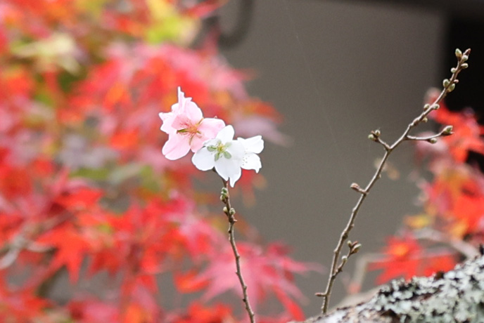 左は「芹生」、温泉の湯本の料理旅館で、四つ星ホテルでもあります。坂を上った三千院の石段横からも入れます。建物の前にある不断桜は紅葉の頃に満開となり春まで咲き続けるそうです(源平咲きでした、最後の写真)。