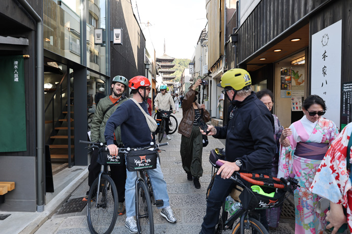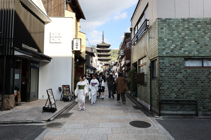 この通りはいつも八坂の搭が見えていて、京都らしい情緒のある雰囲気で外国人にも人気があります。夏と比べると、外国人観光客の年齢が少し高い気がします。一筋目の南北の道を横切ります。