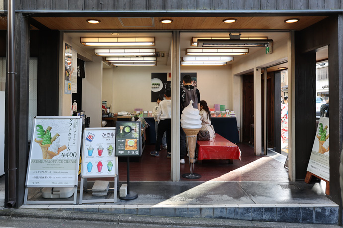 「京ゆば工房」 湯葉専門店で、国産大豆を使い、店先の工房でつくられた湯葉や豆乳が味わえます。生ゆばは柚子風味の自家製ポン酢をかけてあっさりと。豆乳はかわいらしい湯呑に入っていて、温か冷を選べます。テイクアウトもできます。