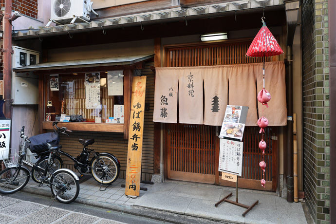 「八坂 魚藤 (うおとう)」 京料理のお店で、名物のゆば鍋弁当は、ゆば鍋、付き出し、刺し身、炊きあわせ、焼肴、湯葉ちりめんの御飯、吸い物、香の物で2200円、うなぎ蒲焼付きで2800円。昼は松華堂弁当もあり、夜は本格的な懐石料理が頂けます。