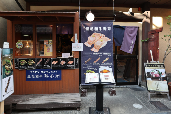 左(北)に「和牛レストラン 熱心屋」 2020年にオープンした肉料理のお店で旧店名は牛右衛門。主にブランド牛・黒毛和牛を扱い、肉寿司が評判です。