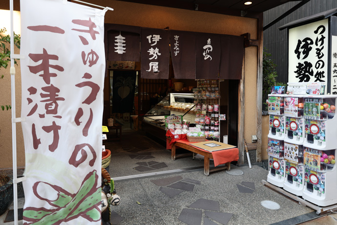 「伊勢屋」 京つけもののお店で、約100年前に三重県鈴鹿で漬け込んだ伊勢沢庵を行商したのが始まりです。ここに店を構えて約80年以上、現在の5代目は食事のしめに合う漬け物を目指しているそうです。