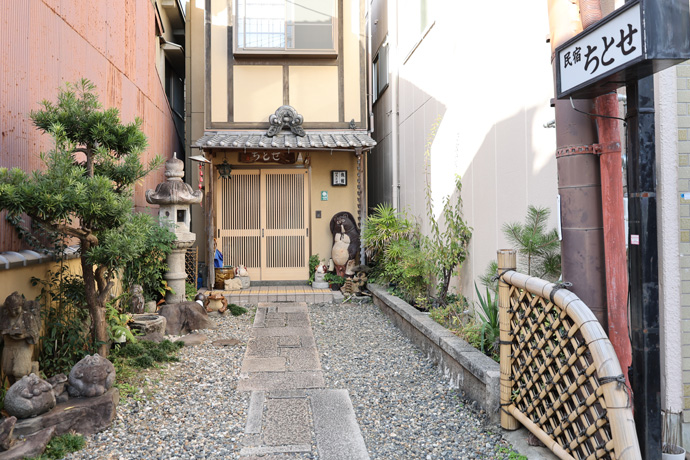 「民宿 ちとせ」 客室は4名までの部屋が2部屋、2名までの部屋が3部屋あります。お風呂とトイレは共同で、お風呂は夕方から朝まで入れます。安井金比羅宮の近くに別館があります。横は二筋目の通りで、今日はここまでです。