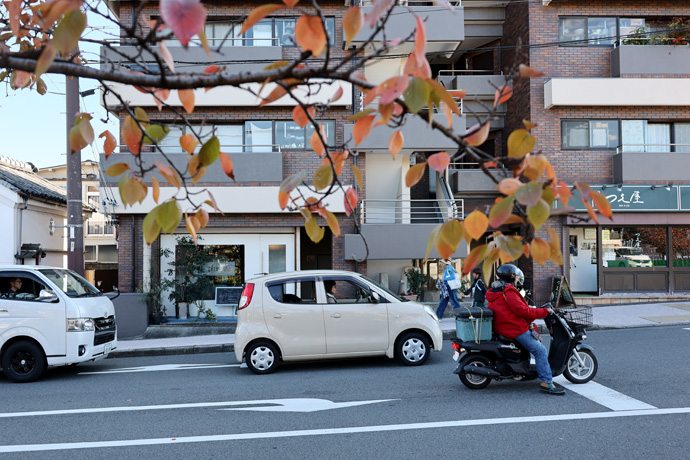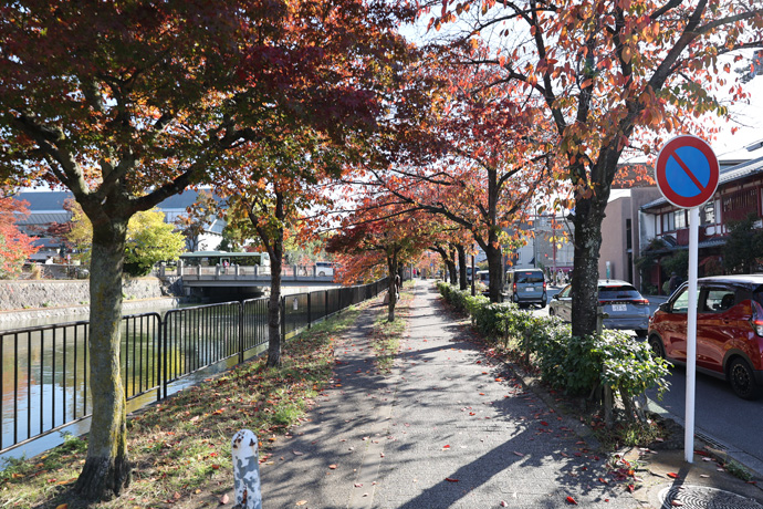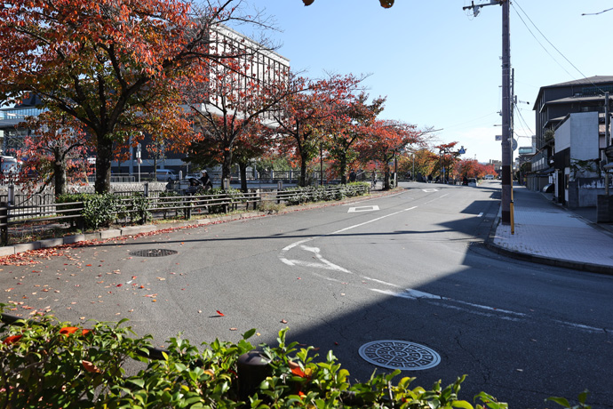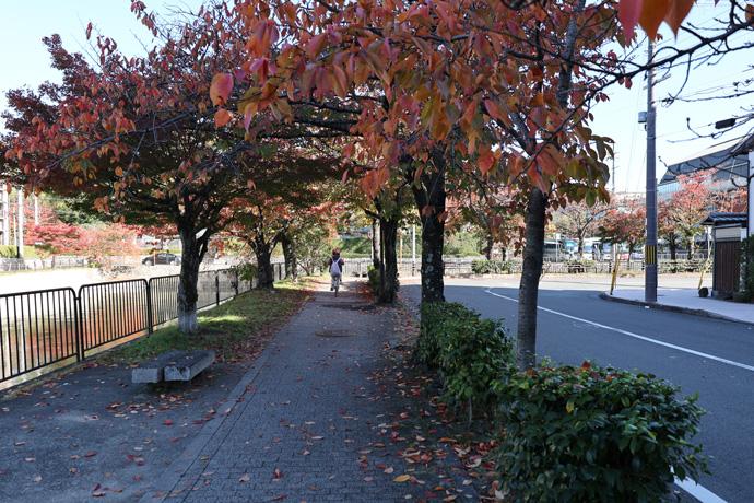 歩いているのは冷泉通に沿う遊歩道で、ここは桜並木でもあります。桜の木はカエデより早く紅葉して、すぐに葉が枯れて落ちてしまいます。桜紅葉は本格的な紅葉シーズンの先駆けです。