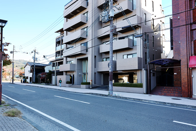 東大路通と冷泉通の交差点南東は「一浦マンション」、築1983年、5階建、10戸、2LDKの賃貸マンションで、1階西にステッキの専門店「つえ屋 東山冷泉店」、東に美容院の「J three(ジェイスリー)」があります。