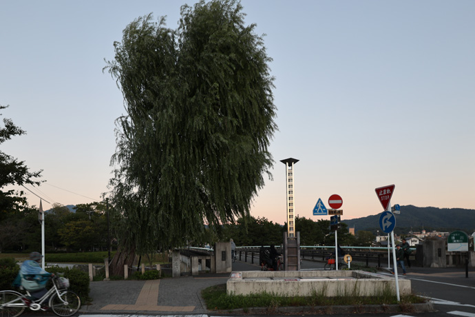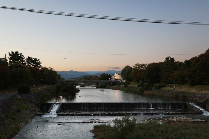 明治以前の鴨川にかかる本格的な橋は三条大橋と五条大橋だけで、今出川口橋も中州に木を渡して造った仮橋でした。下は出町橋から上流方向、最後の写真は下流方向で日が沈んで空が暗くなってきました。