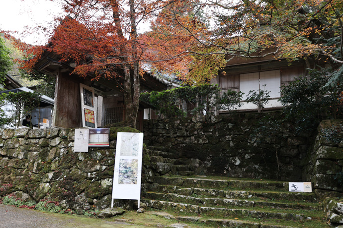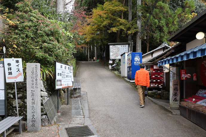 下の写真は呂川沿いの道で、右は「一福茶屋」、左には「重要文化財 三重石塔 融通念佛宗宗祖 聖應大師良忍上人御廟」という石標があります。左端に車イス参拝路という看板も見えます。