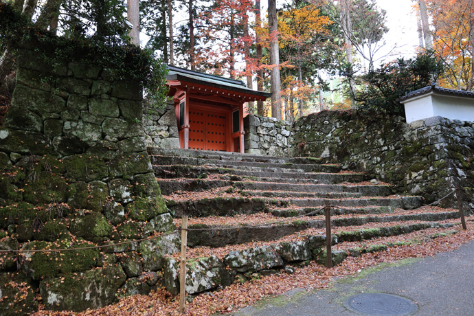 三千院の寺伝によると、平安時代後期の1125年、良忍上人が声明道の守護神として大和多武峰より勧請したといわれています。(鳥居をくぐってしばらく歩くと律川を渡る橋があります。)