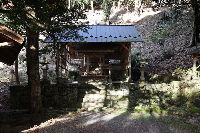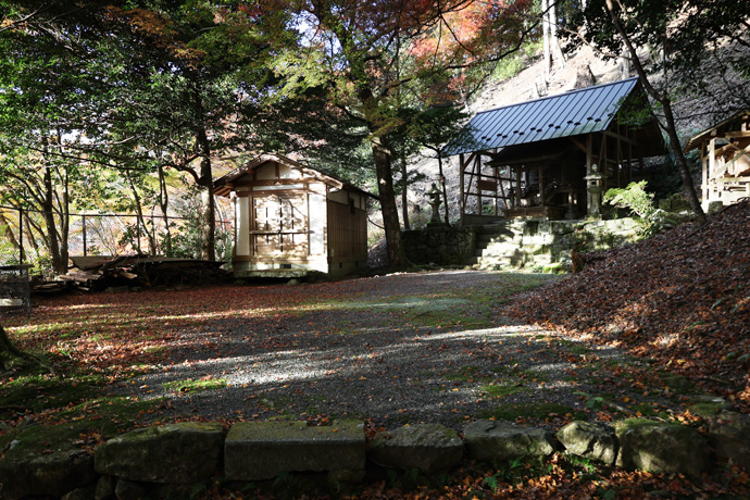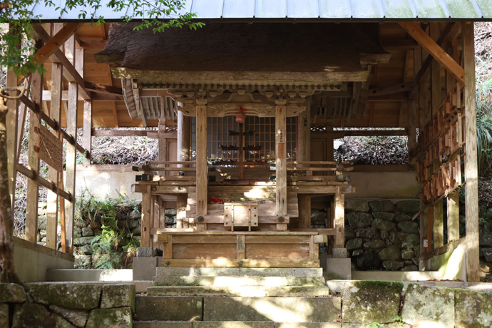そのとき、神輿が動かなくなり皆が不審に思っていると、小童子の明神が神輿に乗り移っています。(橋を渡るとちょっとした境内になっていて、蔵や祠、右には小社もあります。)