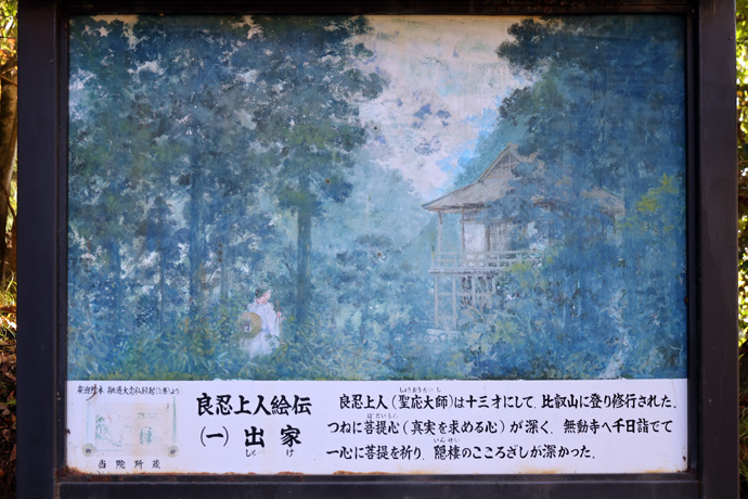 少し呂川を遡ると、右に良忍上人の半生を描いた「良忍上人絵伝」が並んでいます。この道は来迎院やその支院への参道、および良忍上人の御廟への参拝路でもあります。