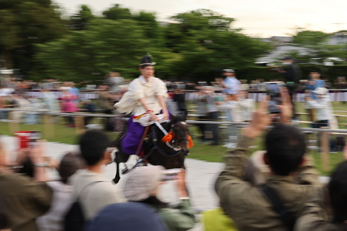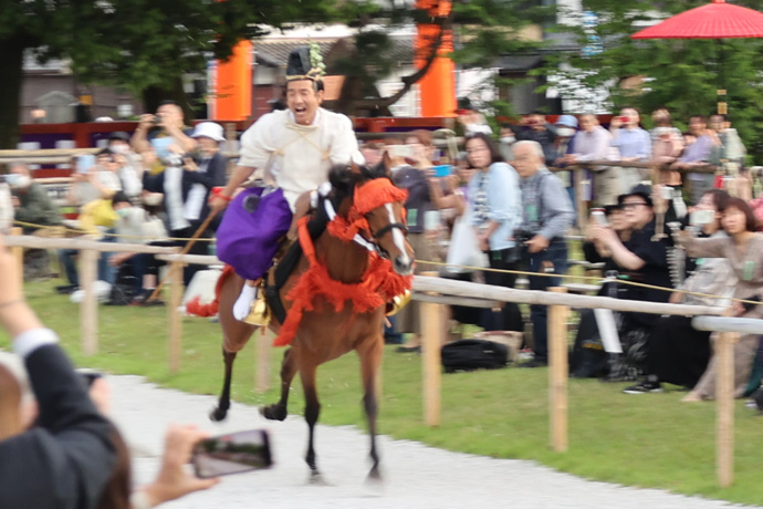 馬場元(南)から公家装束の3名の射手が登場し、約400mの馬場に100m間隔に設けられた3つの的を馬上から鏑矢で狙います。公家装束で騎乗して的を射ることを「騎射」というそうです。