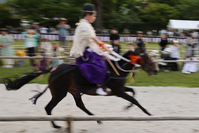 室町時代には衛門府出仕武官により、江戸時代には伏見奉行所の衛士警護の武士や、各藩の馬術指南役、町衆らが技を競いあいました。「藤下がり」、敵矢に当たったと見せて駈ける技です。